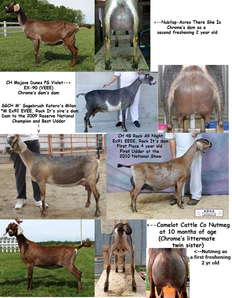 Chrome's littermate twin sister, Camelot Cattle Co Nutmeg, freshened as a 2 year old with a beautiful, productive udder. Nutmeg's owner says, "Nutmeg freshened for the first time in March [2016] with triplet doelings. She is doing an outstanding job, feeding them, and sharing with me as well! Nutmeg is a laid back, easy keeper, but obviously hardworking. I can't say enough good things about this doe."